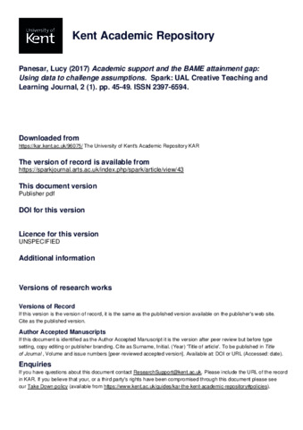 Panesar, Lucy (2017) Academic support and the BAME attainment gap: Using data to challenge assumptions. Spark: UAL Creative Teaching and Learning Journal, 2 (1). pp. 45-49. ISSN 2397-6594. (KAR id:96075)