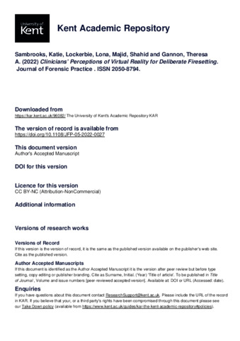 Sambrooks, Katie, Lockerbie, Lona, Majid, Shahid, Gannon, Theresa A. (2022) Clinicians’ Perceptions of Virtual Reality for Deliberate Firesetting. Journal of Forensic Practice, . ISSN 2050-8794. (doi:10.1108/JFP-05-2022-0027) (KAR id:96082)