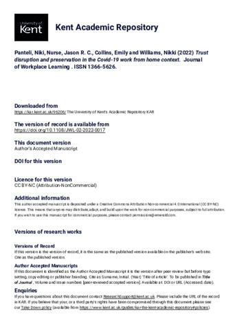 Panteli, Niki, Nurse, Jason R. C., Collins, Emily, Williams, Nikki (2022) Trust disruption and preservation in the Covid-19 work from home context. Journal of Workplace Learning, . ISSN 1366-5626. (doi:10.1108/JWL-02-2022-0017) (KAR id:96206)
