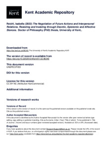 Reichl, Isabella (2022) The Negotiation of Future Actions and Interpersonal Relations. Resisting and Insisting through Deontic, Epistemic and Affective Stances. Doctor of Philosophy (PhD) thesis, University of Kent,. (doi:10.22024/UniKent/01.02.96340) (KAR id:96340)