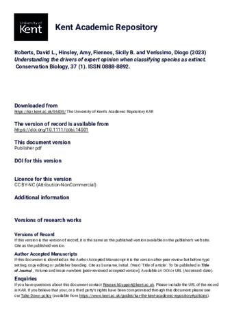 Roberts, David L., Hinsley, Amy, Fiennes, Sicily B., Veríssimo, Diogo (2023) Understanding the drivers of expert opinion when classifying species as extinct. Conservation Biology, 37 (1). Article Number e13968. ISSN 0888-8892. (doi:10.1111/cobi.14001) (KAR id:96839)