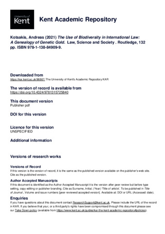 Kotsakis, Andreas (2021) The Use of Biodiversity in International Law: A Genealogy of Genetic Gold. Law, Science and Society . Routledge, 132 pp. ISBN 978-1-138-84909-9. E-ISBN 978-1-315-72584-0. (doi:10.4324/9781315725840) (KAR id:96867)