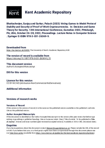 Bhattacherjee, Sanjay, Sarkar, Palash (2023) Voting Games to Model Protocol Stability and Security of Proof-of-Work Cryptocurrencies. In: Decision and Game Theory for Security. 13th International Conference, GameSec 2022, Pittsburgh, PA, USA, October 26–28, 2022, Proceedings. Lecture Notes in Computer Science . Springer E-ISBN 978-3-031-26369-9. (doi:10.1007/978-3-031-26369-9_15) (KAR id:96909)