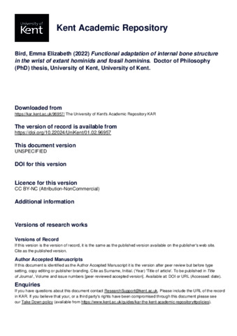 Bird, Emma Elizabeth (2022) Functional adaptation of internal bone structure in the wrist of extant hominids and fossil hominins. Doctor of Philosophy (PhD) thesis, University of Kent, University of Kent. (doi:10.22024/UniKent/01.02.96957) (KAR id:96957)