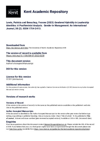 Lewis, Patricia, Benschop, Yvonne (2023) Gendered Hybridity in Leadership Identities: A Postfeminist Analysis. Gender in Management: An International Journal, 38 (2). ISSN 1754-2413. (doi:10.1108/GM-07-2022-0238) (KAR id:97064)