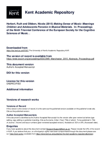 Herbert, Ruth, Dibben, Nicola (2015) Making Sense of Music: Meanings Children and Adolescents Perceive in Musical Materials. In: Proceedings of the Ninth Triennial Conference of the European Society for the Cognitive Sciences of Music. . (KAR id:97567)