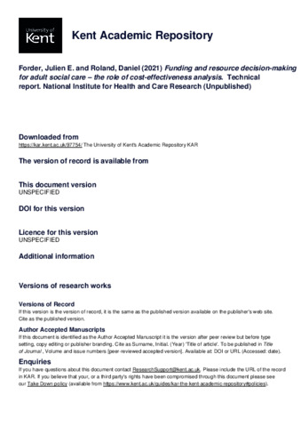 Forder, Julien E. and Roland, Daniel (2021) Funding and resource decision-making for adult social care – the role of cost-effectiveness analysis. Technical report. National Institute for Health and Care Research (Unpublished) (KAR id:97754)