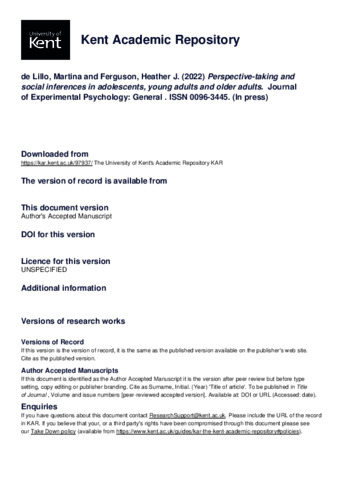de Lillo, Martina, Ferguson, Heather J. (2023) Perspective-taking and social inferences in adolescents, young adults and older adults. Journal of Experimental Psychology: General, . ISSN 0096-3445. (doi:10.1037/xge0001337) (KAR id:97937)