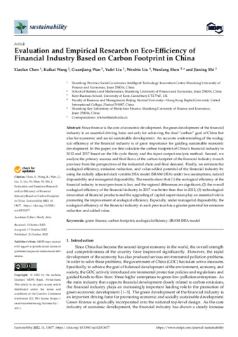 Chen, Xiaolan, Wang, Kaikai, Wan, Guanjiang, Liu, Yufei, Liu, Wenbin, Shen, Wanfang, Shi, Jianing (2022) Evaluation and Empirical Research on Eco-Efficiency of Financial Industry Based on Carbon Footprint in China. Sustainability, 14 (20). Article Number 13677. ISSN 2071-1050. (doi:10.3390/su142013677) (KAR id:97979)