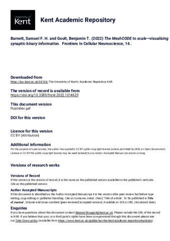 Barnett, Samuel F. H., Goult, Benjamin T. (2022) The MeshCODE to scale—visualising synaptic binary information. Frontiers in Cellular Neuroscience, 16 . Article Number 1014629. E-ISSN 1662-5102. (doi:10.3389/fncel.2022.1014629) (KAR id:98138)