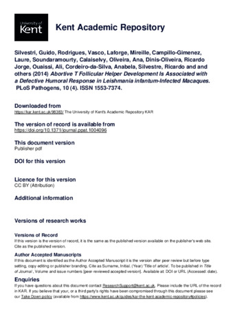 Silvestri, Guido, Rodrigues, Vasco, Laforge, Mireille, Campillo-Gimenez, Laure, Soundaramourty, Calaiselvy, Oliveira, Ana, Dinis-Oliveira, Ricardo Jorge, Ouaissi, Ali, Cordeiro-da-Silva, Anabela, Silvestre, Ricardo, and others. (2014) Abortive T Follicular Helper Development Is Associated with a Defective Humoral Response in Leishmania infantum-Infected Macaques. PLoS Pathogens, 10 (4). Article Number e1004096. ISSN 1553-7374. (doi:10.1371/journal.ppat.1004096) (KAR id:98383)