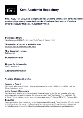 Ning, Yuye, Tse, Gary, Luo, Guogang, Li, Guoliang (2021) Atrial cardiomyopathy: an emerging cause of the embolic stroke of undetermined source. Frontiers in Cardiovascular Medicine, 8 . Article Number 674612. ISSN 2297-055X. (doi:10.3389/fcvm.2021.674612) (KAR id:98432)