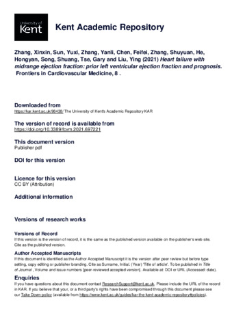 Zhang, Xinxin, Sun, Yuxi, Zhang, Yanli, Chen, Feifei, Zhang, Shuyuan, He, Hongyan, Song, Shuang, Tse, Gary, Liu, Ying (2021) Heart failure with midrange ejection fraction: prior left ventricular ejection fraction and prognosis. Frontiers in Cardiovascular Medicine, 8 . Article Number 697221. E-ISSN 2297-055X. (doi:10.3389/fcvm.2021.697221) (KAR id:98438)
