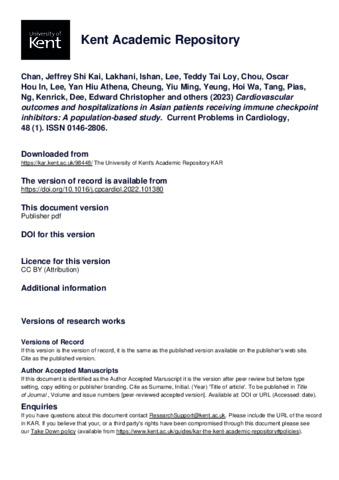 Chan, Jeffrey Shi Kai, Lakhani, Ishan, Lee, Teddy Tai Loy, Chou, Oscar Hou In, Lee, Yan Hiu Athena, Cheung, Yiu Ming, Yeung, Hoi Wa, Tang, Pias, Ng, Kenrick, Dee, Edward Christopher, and others. (2023) Cardiovascular outcomes and hospitalizations in Asian patients receiving immune checkpoint inhibitors: A population-based study. Current Problems in Cardiology, 48 (1). Article Number 101380. ISSN 0146-2806. (doi:10.1016/j.cpcardiol.2022.101380) (KAR id:98448)