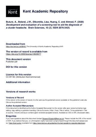 Buture, A., Boland, J.W., Dikomitis, Lisa, Huang, C., Ahmed, F. (2020) Development and evaluation of a screening tool to aid the diagnosis of a cluster headache. Brain Sciences, 10 (2). ISSN 2076-3425. (doi:10.3390/brainsci10020077) (KAR id:98461)