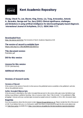 Chung, Cheuk To, Lee, Sharen, King, Emma, Liu, Tong, Armoundas, Antonis A., Bazoukis, George, Tse, Gary (2022) Clinical significance, challenges and limitations in using artificial intelligence for electrocardiography-based diagnosis. International Journal of Arrhythmia, 23 (1). Article Number 24 (2022). ISSN 2466-1171. (doi:10.1186/s42444-022-00075-x) (KAR id:98703)