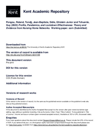 Pongou, Roland and Tondjj, Jean-Baptiste and Sidie, Ghislain Junior and Tchuente, Guy (2022) Profits, Pandemics, and Lockdown Effectiveness: Theory and Evidence from Nursing Home Networks. Working paper. SSRN (Submitted) (KAR id:98818)