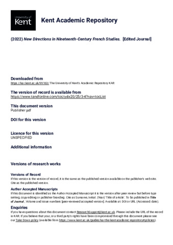 Duffy, Larry and Belenky, Masha and Watts, Andrew, eds. (2022) New Directions in Nineteenth-Century French Studies. Dix-Neuf, 25 (3-4). pp. 173-344. ISSN 1478-7318. (KAR id:99163)