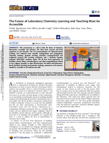 Egambaram, Orielia, Hilton, Kira, Leigh, Jennifer, Richardson, Robert, Sarju, Julia, Slater, Anna, Turner, Bethan (2022) The Future of Laboratory Chemistry Learning and Teaching Must be Accessible. Journal of Chemical Education, 99 (12). pp. 3814-3821. ISSN 0021-9584. E-ISSN 1938-1328. (doi:10.1021/acs.jchemed.2c00328) (KAR id:99164)