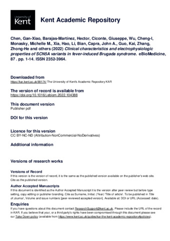 Chen, Gan-Xiao, Barajas-Martínez, Hector, Ciconte, Giuseppe, Wu, Cheng-I, Monasky, Michelle M., Xia, Hao, Li, Bian, Capra, John A., Guo, Kai, Zhang, Zhong-He, and others. (2022) Clinical characteristics and electrophysiologic properties of SCN5A variants in fever-induced Brugada syndrome. eBioMedicine, 87 . pp. 1-14. ISSN 2352-3964. (doi:10.1016/j.ebiom.2022.104388) (KAR id:99174)