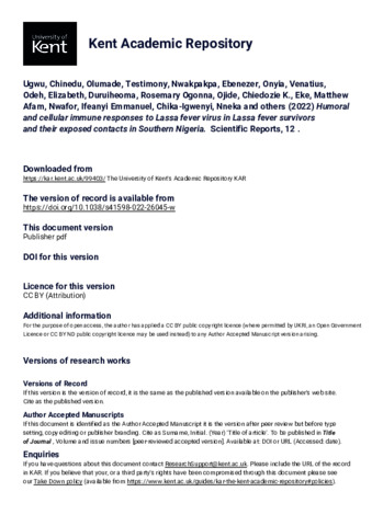 Ugwu, Chinedu, Olumade, Testimony, Nwakpakpa, Ebenezer, Onyia, Venatius, Odeh, Elizabeth, Duruiheoma, Rosemary Ogonna, Ojide, Chiedozie K., Eke, Matthew Afam, Nwafor, Ifeanyi Emmanuel, Chika-Igwenyi, Nneka, and others. (2022) Humoral and cellular immune responses to Lassa fever virus in Lassa fever survivors and their exposed contacts in Southern Nigeria. Scientific Reports, 12 . Article Number 22330. E-ISSN 2045-2322. (doi:10.1038/s41598-022-26045-w) (KAR id:99403)