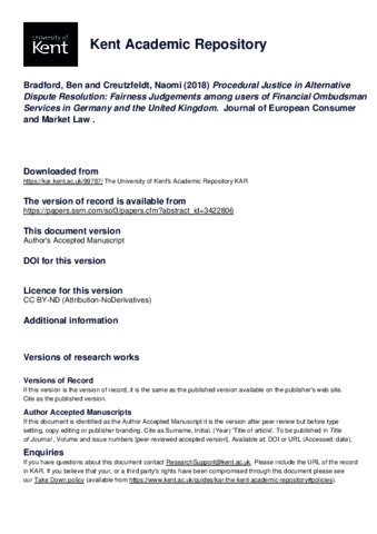 Bradford, Ben, Creutzfeldt, Naomi (2018) Procedural Justice in Alternative Dispute Resolution: Fairness Judgements among users of Financial Ombudsman Services in Germany and the United Kingdom. Journal of European Consumer and Market Law, 7 (5). pp. 188-200. ISSN 2364-4710. (KAR id:99787)