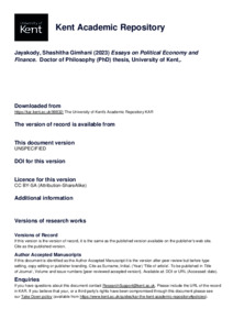 Jayakody, Shashitha Gimhani (2023) Essays on Political Economy and Finance. Doctor of Philosophy (PhD) thesis, University of Kent,. (doi:10.22024/UniKent/01.02.99832) (KAR id:99832)