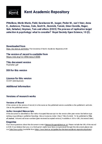 Pittelkow, Merle-Marie, Field, Sarahanne M., Isager, Peder M., van’t Veer, Anna E., Anderson, Thomas, Cole, Scott N., Dominik, Tomáš, Giner-Sorolla, Roger, Gok, Sebahat, Heyman, Tom, and others. (2023) The process of replication target selection in psychology: what to consider? Royal Society Open Science, 10 (2). Article Number 210586. E-ISSN 2054-5703. (doi:10.1098/rsos.210586) (KAR id:99856)