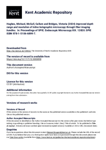 Hughes, Michael, McCall, Callum, Bridges, Victoria (2024) Improved depth range and resolution of inline holographic microscopy through fiber imaging bundles. In: Proceedings of SPIE. Endoscopic Microscopy XIX. 12820. SPIE ISBN 978-1-5106-6899-7. (doi:10.1117/12.3003898) (KAR id:104552)