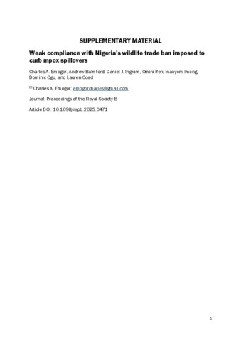 Emogor, Charles A., Balmford, Andrew, Ingram, Daniel J., Iferi, Omini, Imong, Inaoyom, Ogu, Dominic, Coad, Lauren (2025) Weak compliance with Nigeria’s wildlife trade ban imposed to curb mpox spillovers. Proceedings of the Royal Society B: Biological Sciences, 292 (2050). ISSN 0962-8452. (doi:10.1098/rspb.2025.0471) (KAR id:109944)