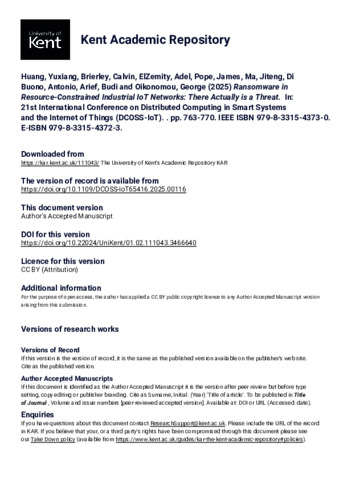 Huang, Yuxiang, Brierley, Calvin, ElZemity, Adel, Pope, James, Ma, Jiteng, Di Buono, Antonio, Arief, Budi, Oikonomou, George (2025) Ransomware in Resource-Constrained Industrial IoT Networks: There Actually is a Threat. In: 21st International Conference on Distributed Computing in Smart Systems and the Internet of Things (DCOSS-IoT). . pp. 763-770. IEEE ISBN 979-8-3315-4373-0. E-ISBN 979-8-3315-4372-3. (doi:10.1109/DCOSS-IoT65416.2025.00116) (KAR id:111043)
