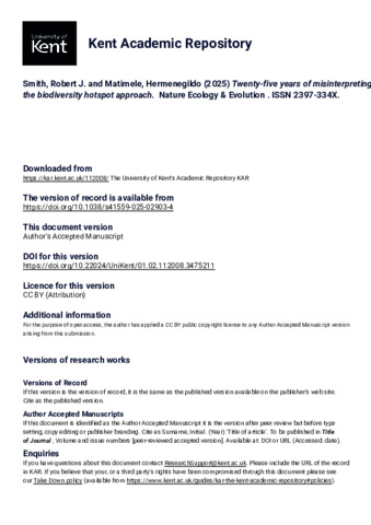 Smith, Robert J., Matimele, Hermenegildo (2025) Twenty-five years of misinterpreting the biodiversity hotspot approach. Nature Ecology & Evolution, . ISSN 2397-334X. (doi:10.1038/s41559-025-02903-4) (KAR id:112008)