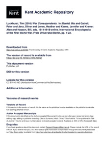| Luckhurst, Tim (2016) War Correspondents. In: Daniel, Ute and Gatrell, Peter and Janz, Oliver and Jones, Heather and Keene, Jennifer and Kramer, Alan and Nasson, Bill, eds. 1914-1918-online. International Encyclopedia of the First World War. Freie Universitat Berlin, pp. 1-22. (doi:10.15463/ie1418.10862) (KAR id:54495) |